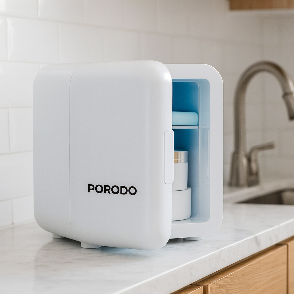 ثلاجة صغيرة Ecochill من Porodo Lifestyle بسعة 4 لتر، مصنوعة من مادة البولي بروبيلين، بقوة 18 - 28 واط، تعمل بهدوء مع تبريد سريع.